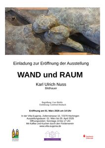Unter dieser Überschrift zeigt die Villa Eugenia, Hechingen, Werke des Bildhauers Karl Ulrich Nuss. Für das Stichwort „WAND“ stehen große Tafeln, auf denen der Künstler Anfang der 1990er Jahre weibliche Akte zeichnete. Diese Tafelbilder werden erstmals der Öffentlichkeit präsentiert! Das Stichwort „Raum“ steht für eine Auswahl kleiner und großer Bronzen, die der Künstler in den vergangenen zwanzig Jahren schuf.