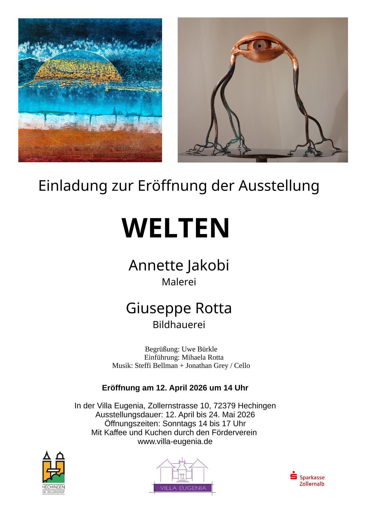 wir laden Sie herzlich zur Eröffnung der Ausstellung „WELTEN“ am 12. April 2026 um 14 Uhr in der Villa Eugenia in Hechingen ein. In der besonderen Atmosphäre dieses historischen Ortes erwartet Sie eine eindrucksvolle Begegnung mit zeitgenössischer Kunst, die unterschiedliche Perspektiven und Ausdrucksformen vereint.
