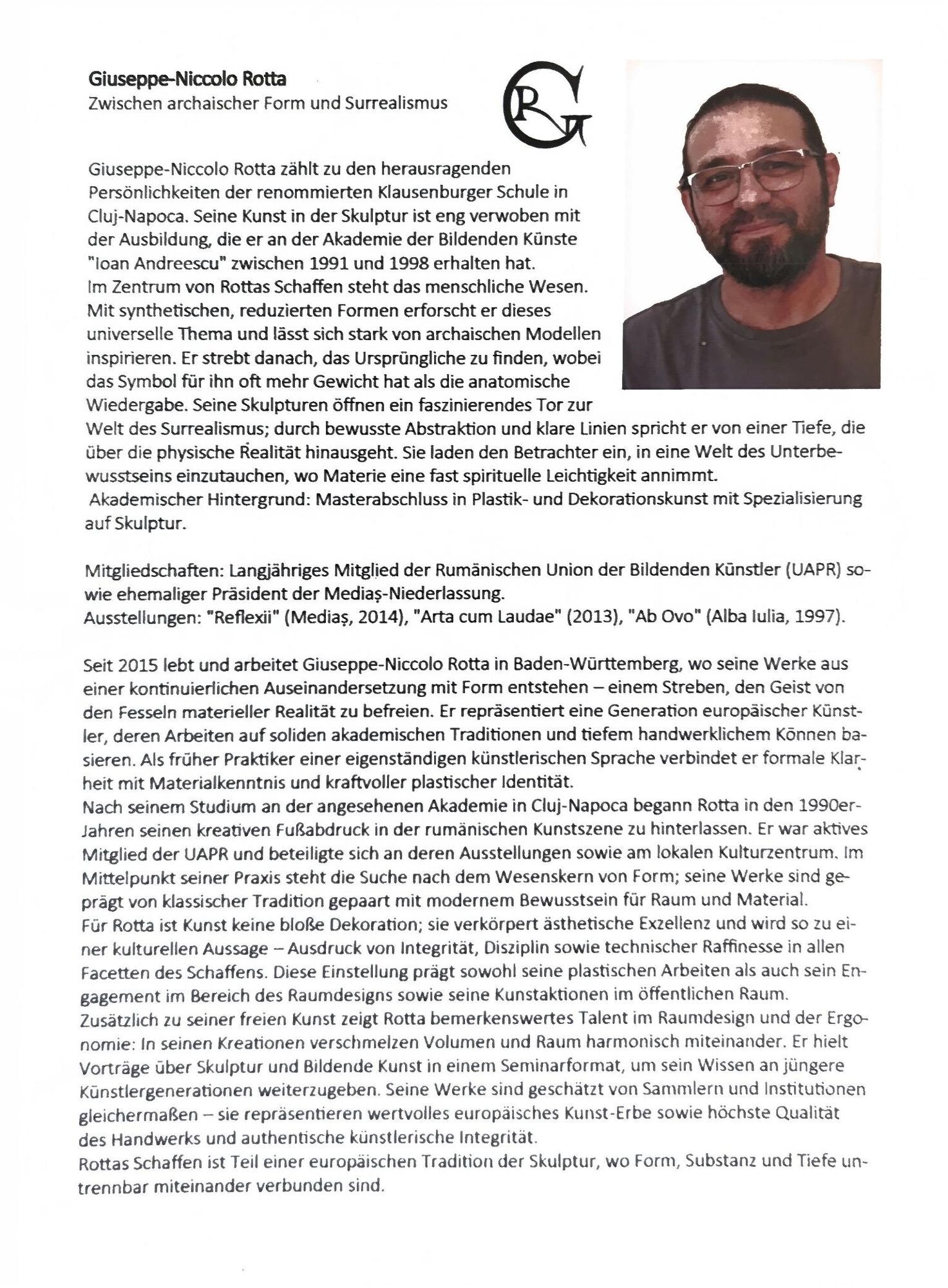 Giuseppe Rotta hingegen erschafft in seiner Bildhauerei plastische Formen, die sich mit Raum, Material und Struktur auseinandersetzen. Seine Skulpturen wirken zugleich kraftvoll und fein ausbalanciert und laden dazu ein, sie aus verschiedenen Perspektiven zu erleben. Durch die Verbindung von handwerklicher Präzision und künstlerischer Vision entstehen Werke von zeitloser Präsenz.